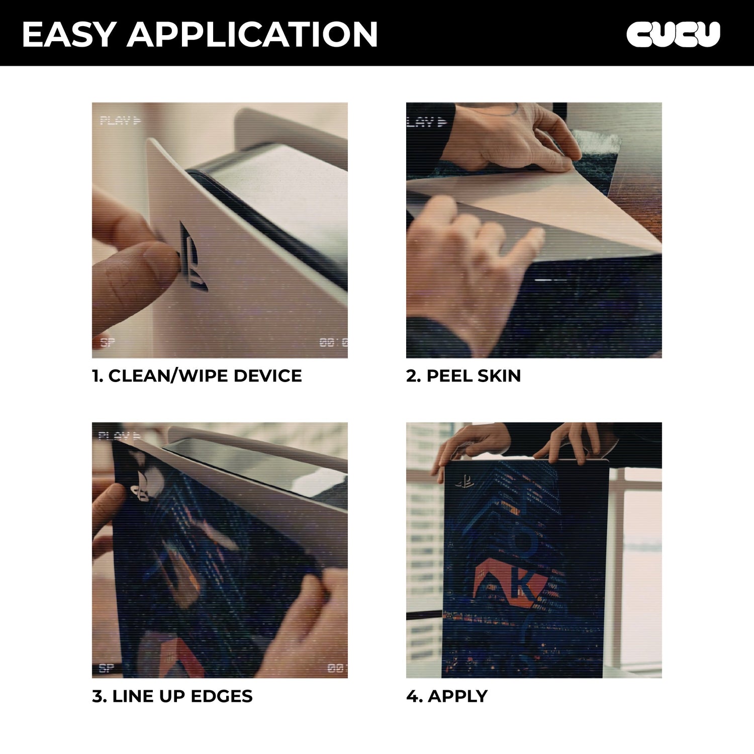 To install your CUCU Device Skin just peel back part of the new skin and align it to the upper edge of the device. Slowly peel back while aligning it and adjust as necessary. Only apply pressure to it once you are satisfied and it will place itself on there. When ready to remove it will come off with no residue.